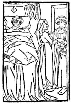 В изображенном эпизоде из самого известного средневекового французского фарса пройдоха адвокат Пателен, обманом заполучивший ткань у суконщика Гийома, прикидывается умирающим, пока его жена Гийметта переговаривается с Гийомом в дверях.