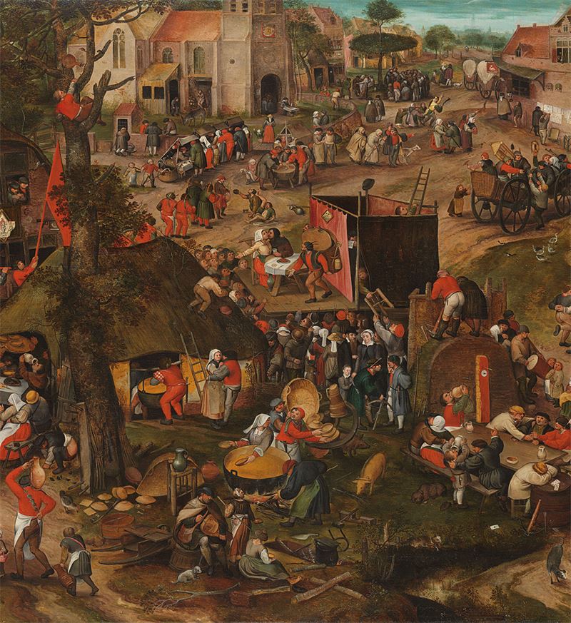 [44] Фарс, разыгрываемый на передвижной сцене во время сельской ярмарки. Деталь картины Питера Балтена. Середина XVI века