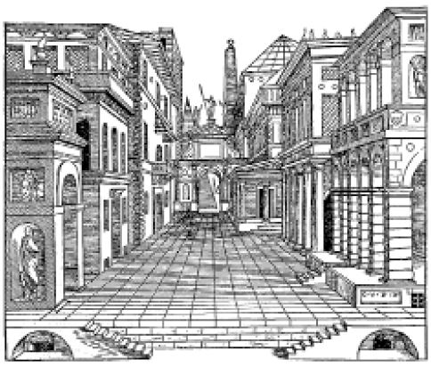 Серлио, автор трактата по архитектуре, вторая часть которого, посвященная театру, была опубликована в 1545 году, стал первым художником, обнародовавшим свои сценические проекты. Три знаменитые перспективные декорации, предназначенные для театра в королевском дворце или в пиршественном зале дома знатного вельможи, предлагали базовую идею, которую в течение последующих четырехсот лет эксплуатировали все европейские сценографы. Эскизы декораций к комедии [53] и трагедии [54] представляют собой перспективы улиц c домами по обе стороны, изображенные на задниках с боковыми створками. На эскизе декорации к сатировой драме [55] (о которой итальянцы знали лишь то, что это был деревенский фарс), изображена сельская местность с деревьями и двумя пасторальными хижинами по краям. Эти изображения положили начало стилю оформления пышных итальянских представлений, чье развитие привело к появлению архитектурной арки просцениума, заменившей собой простой проем в стене, отделявшей игровое пространство от зрительного зала. Описанные проекты оказали влияние на сценическое оформление английского театра масок, испанского придворного театра и французского театра времен Мольера, а также мелодрамы XIX века. Даже когда симметричную перспективу Серлио, усвоенную всеми его последователями, дополнили декорации с угловой перспективой, введенные младшим поколением династии Бибиена [52], прежняя компоновка зданий и деревьев всё еще составляла основу для контрастирующих городских и сельских сцен.