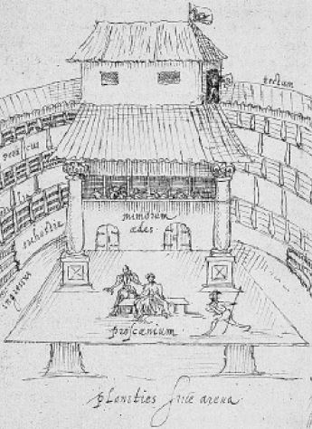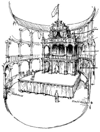 Этот рисунок – единственное дошедшее до нас аутентичное изображение внутреннего двора елизаветинского театра – подтверждает свидетельства о существовании в «Лебеде» большой открытой сцены, сценического здания с колоннами и флагом, а также наличие трех галерей для зрителей.