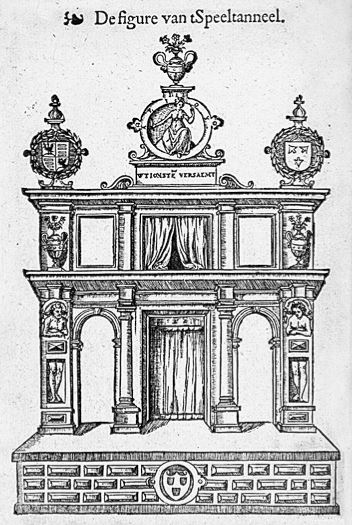 Подобные сцены строились для публичных выступлений членов фламандских кружков риторики (редерейкеров) и представляли собой площадки перед двухэтажным сооружением с порталом, обрамленным двумя колоннами (портал и окно во втором этаже имеют занавесы). Джеймс Бёрбедж наверняка оглядывался на эти сооружения, когда строил лондонский «Театр».