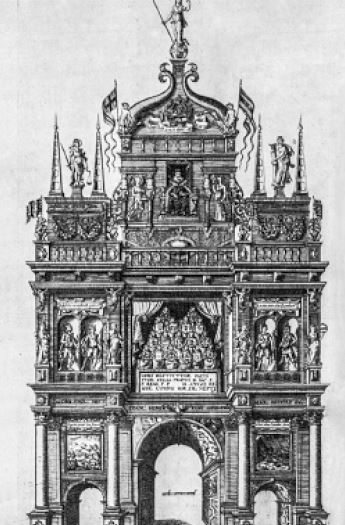 [77] Арка для коронации Иакова I, построенная в 1603 году у Королевской биржи на улице Корнхилл
