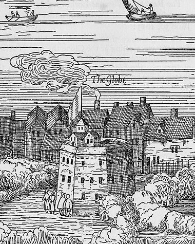 Второе, восьмиугольное, здание знаменитого лондонского театра было построено в 1614 году, а первое, нанесенное на карту Лондона 1600 года, составленную Норденом, было круглым (таким театр изображен на гравюре Холлара 1644 года). Флаг и фигурки людей у двери могут означать, что спектакль уже идет.