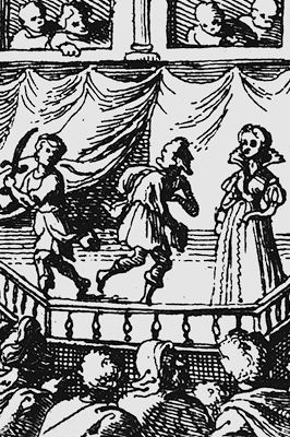Задником на временной сцене-платформе служит занавес, что больше похоже на теренциеву сцену (см. ил. 45–49) и сцену комедии дель арте (см. ил. 61 и 69), чем на солидные архитектурные сооружения позади сцены в публичных театрах Лондона.