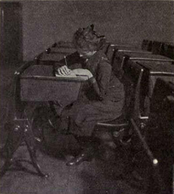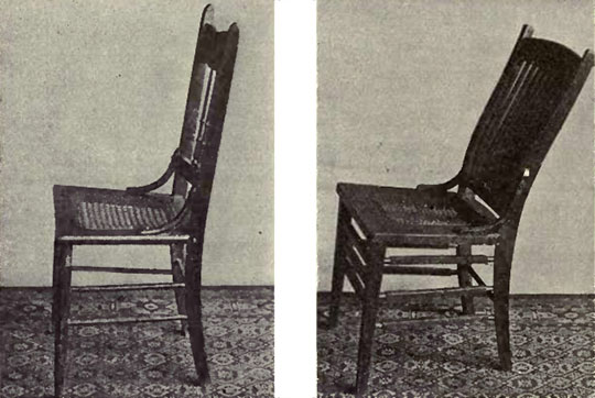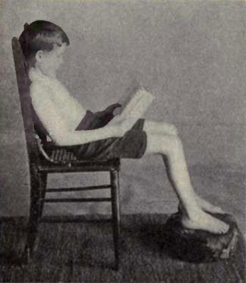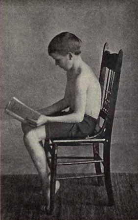 Чтобы сохранить правильную осанку, грудная клетка должна быть поднята высоко. Если бедра и плечи касаются спинки стула, как положено, позвоночник обязательно изогнется внутрь, как у мальчика на рисунке. Если человек сидит на стуле с прямой спиной, ему будет утомительно сохранять правильную осанку без использования подушки или подушечки, прикрепленной к стулу для поддержки изгиба спины. И все же лучше, чтобы стул был изготовлен таким образом, чтобы при правильном положении спины он соответствовал ей.