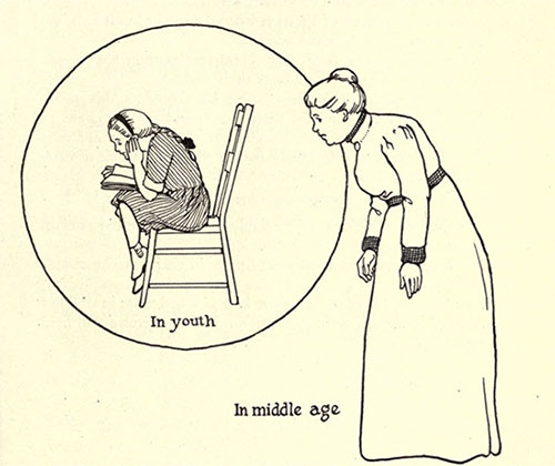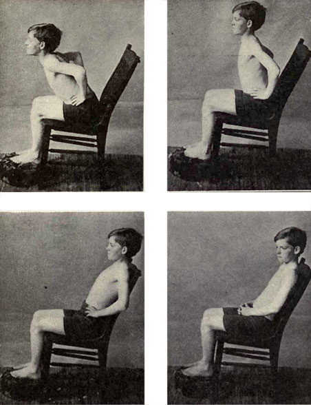 Обычай сидеть на возвышенных сиденьях на самом деле не так прост и естественен, как сидеть или откидываться на земле или на полу. Часто человек сидит так небрежно, что его спина выгибается назад, голова опускается вперед, грудная клетка становится плоской и настолько тесной, что он не может дышать глубоко и полно.