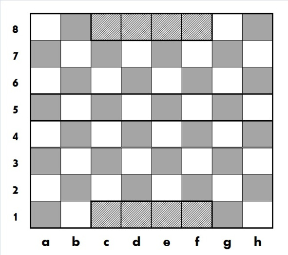 Теперь скажем об отличии игрового поля chess-t1 от шахматной доски. На каждой половине доски есть особая группа полей, состоящая из четырех клеток, называемая замком (крепостью). Замок белых составляют четыре клетки в центре 1-й горизонтали: c1, d1, e1 и f1, на «территории» черных четыре клетки в центре 8-й горизонтали – c8, d8, e8 и f8 – составляют замок черных. Как уже было отмечено ранее, клетки замков окрашены в серый цвет со штриховкой. Поля замков могут отличаться от остальных клеток с помощью какого-либо другого цвета. Далее, по ходу изложения правил игры, будет раскрыты особые свойства полей замков.