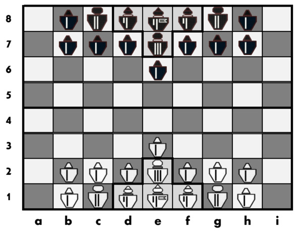 На игровом поле еще выделены три линии между горизонталями. На горизонтальной линии стыка 4-й и 5-й горизонталей жирной линией показана линия соприкосновения «территорий» белых и черных. Также выделены линии стыка 3-й и 4-й горизонталей, и 5-й и 6-й горизонталей, например, двойной линией, переходы фигур через которые будут иметь значение в игре.