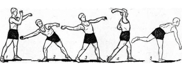 При броске правая нога выпрямляется, туловище, выпрямляясь, поворачивается вперед. В заключительной фазе броска тяжесть тела переносится на ногу, стоящую впереди. Правая нога приставляется к левой.
