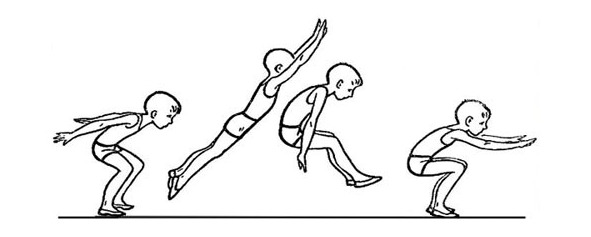 В И.П. руки отводятся назад, и ребенок уходит в полуприсед. При отталкивании, руки выносятся вперед, тем самым помогая ребенку пролететь дальше.