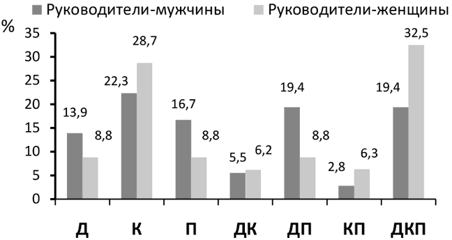 Рис. 1. Распределение типов (n=116) индивидуального стиля руководства у мужчин и женщин (%). Д – директивный стиль; К – коллегиальный стиль; П – попустительский стиль