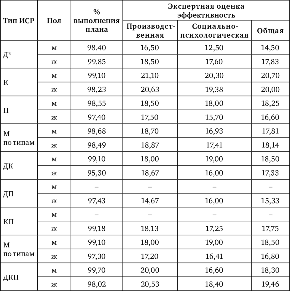 Таблица 3. Средние значения показателя эффективности основных типов ИСР руководителей разного пола (баллы, %), N=56