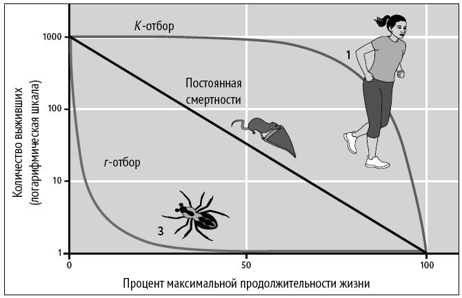 Рис. 2.1. Пример сопоставления стратегий r и К. Продолжительность жизни овинного паука невелика (около одного года), выживаемость потомства при рождении очень мала, в то время как Пиццекрыса и люди идут на различные компромиссы, чтобы сбалансировать выживаемость при рождении и продолжительность жизни