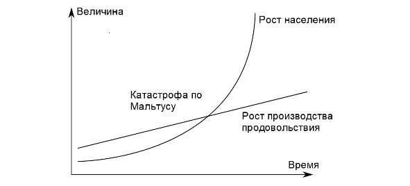 В конце XVIII века английский ученый Томас Мальтус предложил демографическую теорию, согласно которой рост населения происходит гораздо быстрее (в геометрической прогрессии), чем производство продуктов питания (в арифметической прогрессии). Связано это и с ограниченностью территории для выращивания продуктов питания, и с истощением почвы. Томас Мальтус построил две кривые и нашел точку пересечения [1]. На основании своих расчетов Мальтус сделал однозначный вывод о том, что в этот момент неминуемо произойдет кризис. Как следствие – голод, социальные потрясения и войны. По мнению Мальтуса, только войны и эпидемии могут эффективно сокращать население, стабилизируя социальное состояние общества.