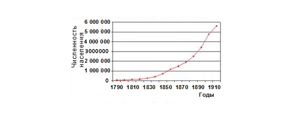 Рисунок 3. График роста населения Нью-Йорка 1790—1920 (статистика и прогноз), 1890 год