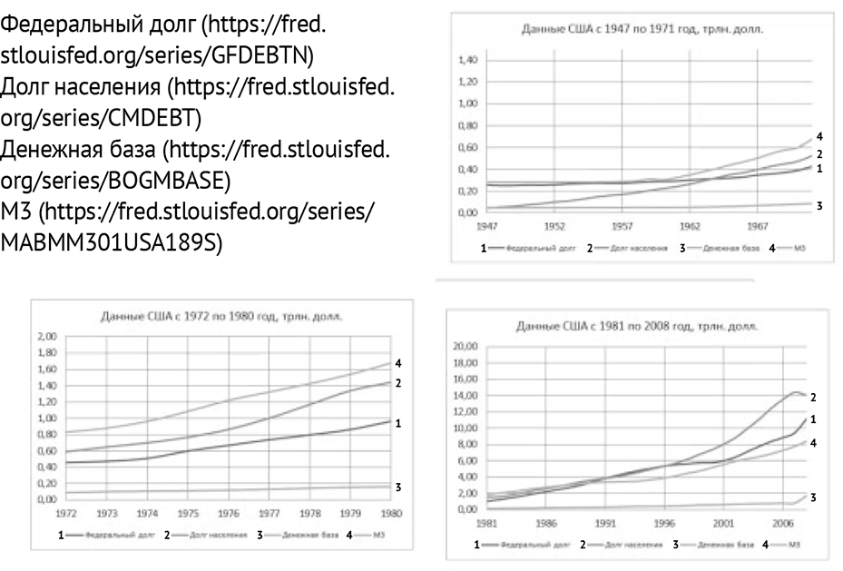 Не сработала эта формула и в США: серьезная эмиссия 20082014 гг. (так называемые программы «ОЕ») не вызвала в этой стране адекватной (если исходить из формулы Фишера) инфляции. Связано это, однако, было не с монетизацией, а с другим важнейшим параметром денежного обращения, кредитным мультипликатором. Грубо говоря, в денежной системе США в указанный период наличные деньги заменяли кредитные, денежная база резко выросла (с 0,8 трлн долларов на момент начала кризиса до 3,3 к моменту окончания эмиссионных программ). А кредитный мультипликатор (т. е. отношение расширенной денежной массы к денежной базе) снизился за это время с 17 примерно до 4. Структура расширенной денежной массы претерпела серьезнейшую трансформацию, а вот ее совокупный объем (от которого и зависит инфляция), выражаемый для США агрегатом М3, практически не изменился.