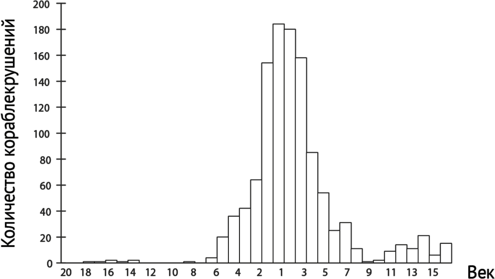 Рис. 3. Относительное количество кораблей, затонувших в Средиземном море, по векам (The cambridge economic history of the greco-roman world)