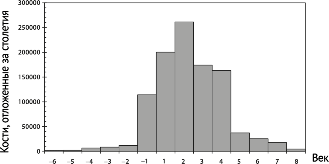А как обстояло дело с животноводством? Да точно так же – вот график обнаруженных костей домашнего скота по векам их датировки. Снова кратное, в разы (!) уменьшение поголовья начиная с V в. нашей эры. Уж казалось бы, трава растет независимо от экономических передряг – однако в Римской империи удавалось содержать огромные стада, а с ее развалом они стали никому не нужны.