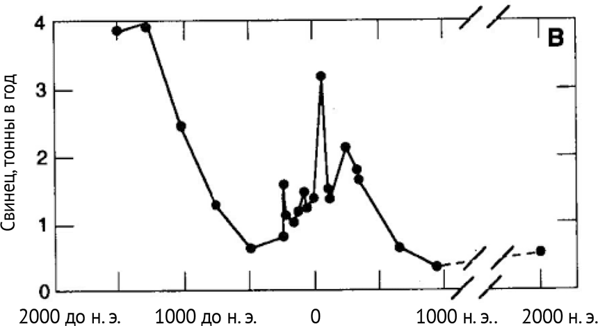 Вверху оценка мирового производства свинца, внизу – концентрация свинца в наслоениях гренландского ледника, послужившая основой для этой оценки. Римская империя оставила значимый след в леднике (!), а уровень производства свинца, достигнутый в I в. нашей эры, упал в 10 раз уже через пару веков и восстановился до римского уровня только с началом промышленной революции в XIX в.! В современной геологической науке есть разные взгляды на причины такого роста количества свинца в ледниках Гренландии в период античной Римской империи. Но поскольку есть и другие данные по масштабу выплавки металлов (просто они не такие наглядные) в этот период и с учетом всех остальных данных, для нас вопрос о высоком индустриальном уровне Римской империи и последующем тысячелетнем спаде представляется очевидным.