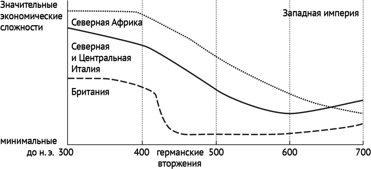 Рис. 6. «Сложность» экономики региона Средиземного моря с 300 по 700 г. н. э. (Bryan Ward-Perkins, «The Fall of Rome»)