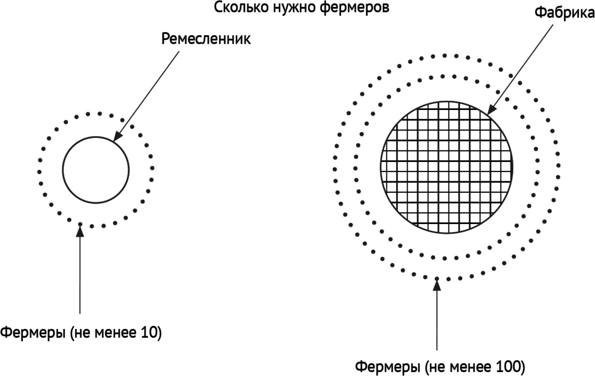 Если размер экономики – одна деревня (вполне типичный случай в странах третьего мира), то никаких фабрик в ней существовать не может, максимум – кузнец и плотник, да и то если деревня большая. А вот если размер экономики – целая страна, с десятками миллионов «фермеров», т. е. конечных потребителей, и есть возможность (римские дороги и римские корабли, которых было в десять раз больше, чем европейских, а также отсутствие таможенных барьеров) доставить фабричные товары в любое место, и у фермеров есть возможность за них заплатить – то фабрики не просто могут, а обязаны появиться. Они становятся экономически выгодными.