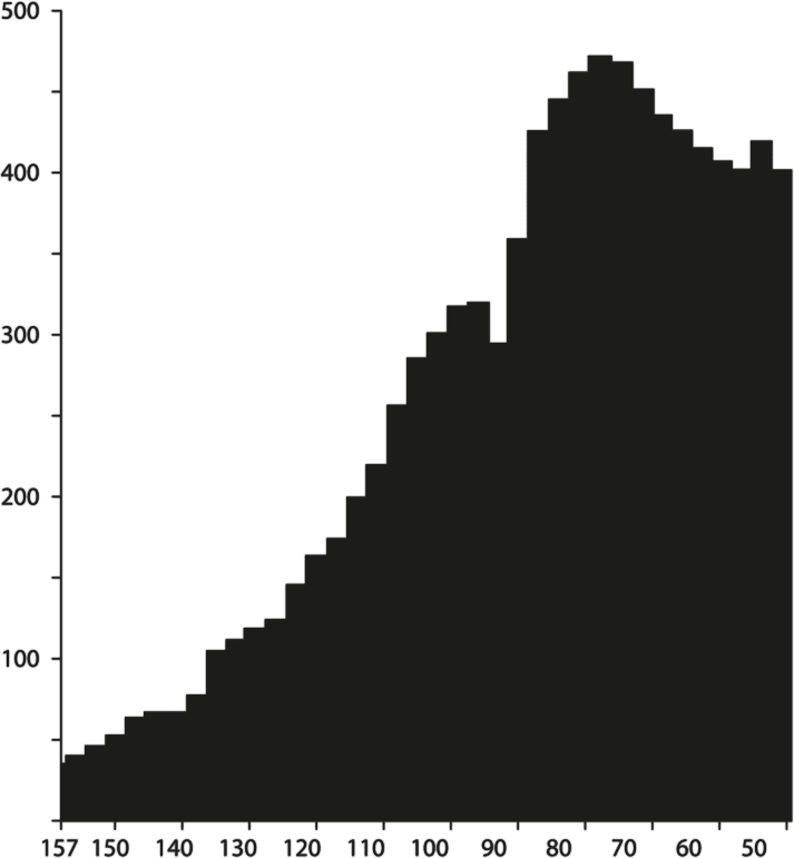 Вот график обнаруженных в Средиземном море затонувших судов по векам их гибели. Разница между I в. (Римская империя) и XV (позднее Средневековье) – в 10 раз, ине в пользу Средневековья. Римская империя производила на порядок больше морских судов, чем Европа 15 веков спустя! Тут, правда, можно сослаться на то, что суда становились все лучше и лучше. Но аргументацию можно продолжить (рис. 4).