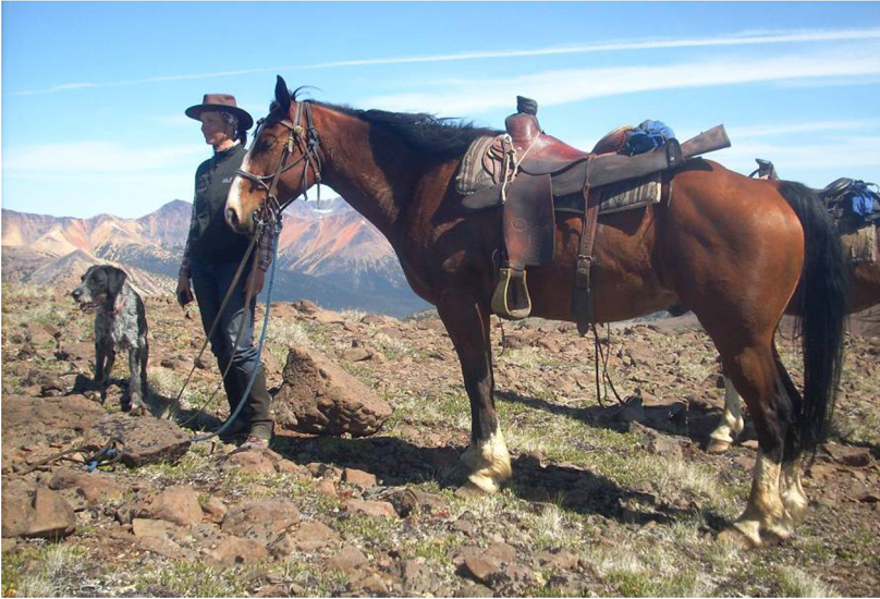Nach wenigen Minuten wird aus dem Weg ein schmaler Pfad, kurz darauf ist auch dieser verschwunden. David gibt, mit der ersten „Packtrain“ im Schlepp, die Richtung vor, die anderen Pferde folgen im Gänsemarsch, wobei sich Paul mit seinen drei Packpferden zwischen uns Gästen einsortiert hat und Joyce mit ihren Lastenträgern am Ende folgt. Nur Willie und Rio patrouillieren hin und her und legen wohl das Vier- oder Fünffache an Kilometern zurück. Im Tal hatte der Reiter sehr wenig zu tun, doch als David in Richtung Waldhang abbiegt, heißt es aufpassen. Der Wald ist dicht, die Bäume stehen eng. Jetzt muss sich jeder seinen eigenen Weg suchen, mehrere Stunden im Zickzack bergauf. Für unsere Pferde ist der Weg zur Baumgrenze und in alpines Gelände harte Arbeit, und die Packpferde müssen oft nach einem besseren Durchschlupf suchen und kleine Umwege in Kauf nehmen. Bei uns Reitern ecken die Knie auch gelegentlich an, und den einen oder anderen Ast drückt man besser weg, bevor er zurückschwingt. Mehr als die Richtung gebe ich meinem Pferd nicht vor, denn es weiß ganz genau, wohin es seine Beine setzen muss. Der Wald hier ist kein europäischer, sondern unberührte Wildnis. Und mit umgestürzten Baumriesen, auch kreuz und quer übereinander liegend, Geröllfeldern, Felsbrocken, Wurzeln, dichtem Unterholz und hohen Farnen kennen sich diese „Mountain-Horses“ bestens aus. Zwischendurch hält David zwar oft an, um den Pferden Verschnaufpausen zu geben, aber dennoch geht es flott vorwärts, bis wir am frühen Nachmittag ein Hochplateau erreichen und hinter einer Baumgruppe eine Rast einlegen, bei der die Packpferde aber nicht entlastet werden. Um uns herum Latschenkiefern, Sträucher, blühende Lupinen und andere Frühlingsblumen, verstreute Fichten, einzeln oder in Gruppen und vom Wind zerzaust, und kleine Schneeflecken auf nahen Hügeln und in Mulden. Hier und dort schimmerte ein kleiner, flacher See, ganz in der Nähe huscht ein Bach als Wasserfall über seine Gesteinskante, und weit am Horizont leuchten die weißen Spitzen der Küstengebirge. Und nachdem die Pferde am Bach ihren Durst stillen konnten, haben auch die drei bis vier Liter Kaffeewasser im „Billy“, der großen, schwarzen Eisenkanne, über dem Lagerfeuer gekocht, so dass es Zeit ist, Brote und Obst auszupacken, die Tasse zu füllen und sich einen Stein als Sitzplatz zu suchen.