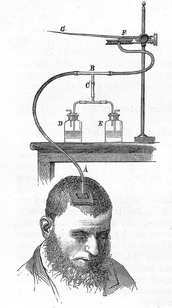 Ил. 0.1. Аппарат для записи «мозгового пульса», использовавшийся итальянским ученым Анжело Моссо для регистрации притока крови к лобной части мозга во время решения умственных задач пациентом.