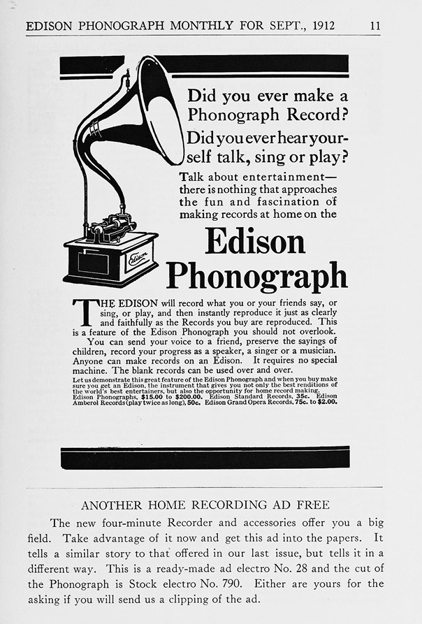 Ил. 2.1 Реклама фонографа Эдисона – аппарата, способного записывать и воспроизводить речь. Бороздки звукозаписи были материальным следом голоса, давшим возможность фонетистам, а также и исследователям вокального мастерства и художественного чтения анализировать малейшие нюансы голоса. Фонограф Эдисона применялся в Институте живого слова С. И. Бернштейном.