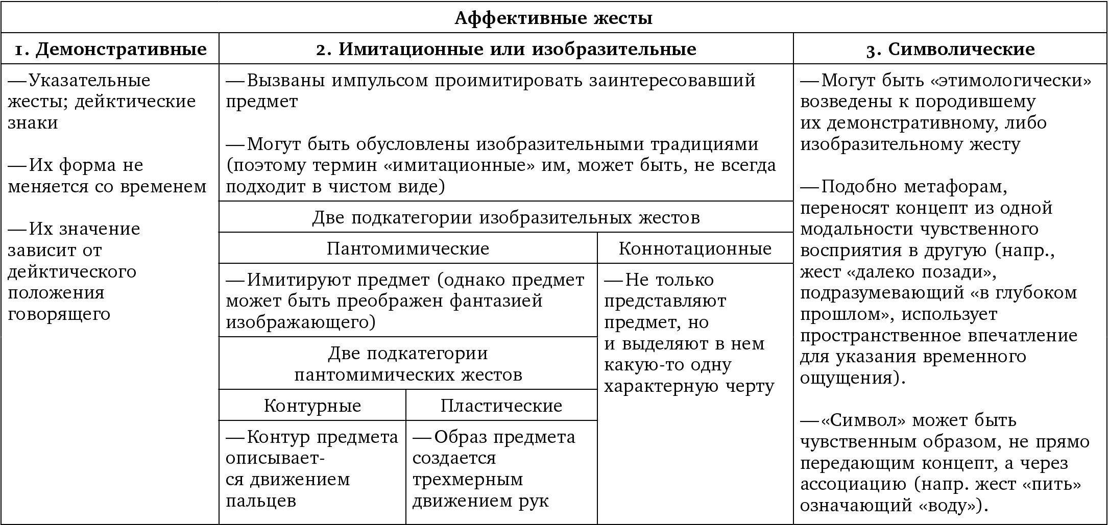 Ученый утверждал, что аффективная мотивация, или драйв, порождавший жест исполнителя, тут же становился очевиден адресату208. Точнее, он считал, что аффект передается адресату через явление, которое Вундт обозначил как «со-жест»209. В ответ на полученный импульс адресат развивает собственные аффекты, формирует представления и выражает свою позицию с помощью собственного, нового жеста. Вундт считал, что такие первичные обмены жестами в итоге усложнились и наполнились нюансами, породив условные или символические выражения, ставшие основой для человеческого языка.