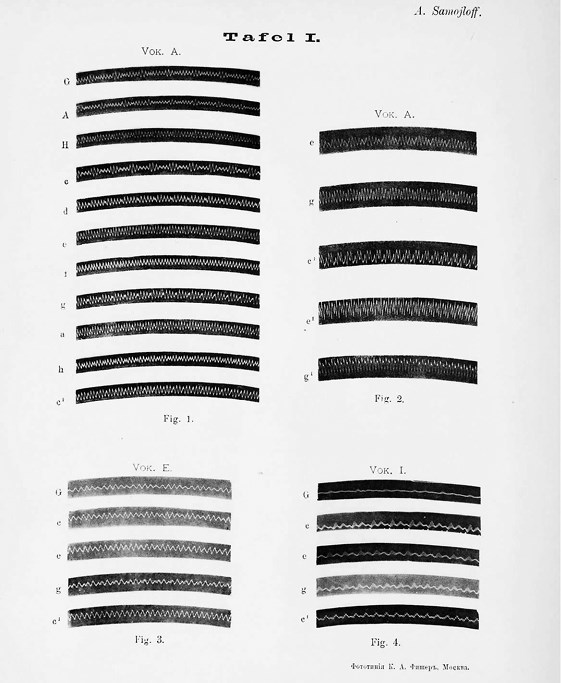 Ил. 2.6. Коллотип А. Самойлова, изображающий запись гласных звуков русского языка. Исследование Самойлова цитируется Эдвардом Скрипчером в книге The Elements of Experimental Phonetics, (New York: Scribner, 1902), 29.