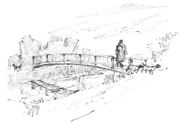 Спустившись с холма, мы свернули налево и пошли вдоль реки к маленькому зеленому мостику. По пути миновали местную пекарню и общественный центр. Сестра активно водит носом, стоит ей лишь почуять ароматы пекарни. У нее всегда есть истории, связанные с едой. Обычно это хитрый план и история, которая впоследствии входит в фольклор спаниелей.