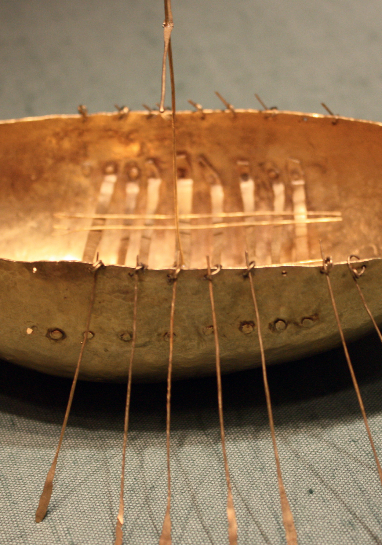 Ancient Ireland was a place of conflict and struggle, but it was also characterized by intense artistry and creativity. The National Gallery of Ireland’s collection provides evidence of this creativity in the form of an immense treasury of Irish gold: jewellery, sheet gold, lunulae and torcs (golden collars or rings), bracelets and earrings – much of it highly and cleverly decorated. Gold was panned from the rivers of Ireland, particularly those flowing from the uplands where seams were known to exist, such as the Wicklow Mountains in Leinster and the Sperrin Mountains in Ulster. Much of this worked gold was buried, plundered, or dispersed over the years – and uncovered by accident. One startling find was the Broighter Hoard, revealed in 1896 by a farmer ploughing his fields on the edge of Lough Foyle in County Derry. He discovered a wooden box filled with gold from the first century BC, including the Broighter Torc and other ornaments, plus the Broighter Boat, fragile but intact and fashioned exquisitely. The hoard is speculated to have been a votive offering to the sea god Manannán Mac Lir, and sunk into what had been the ancient sea-bed.