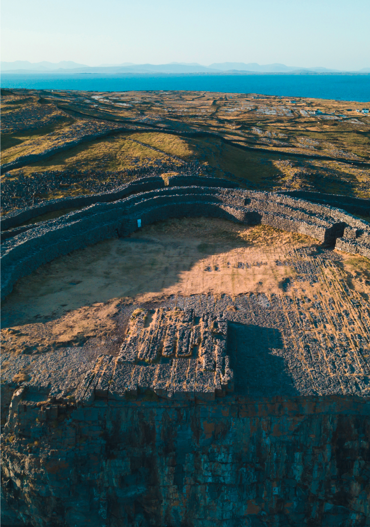 The great fortress of Dún Aonghasa lies on the sheer cliffs along the south coast of Inis Mór (Inishmore), the largest of the Aran Islands. It was memorably described by the Victorian archaeologist George Petrie as the ‘most magnificent barbaric monument extant in Europe’: it is indeed truly spectacular, and its setting against a panorama of ocean and sky adds to the drama. Dún Aonghasa takes the form of a series of concentric stone walls which end on the cliff edge: it is assumed these walls originally enclosed a circular space, but the remainder of the site has collapsed over the centuries into the Atlantic. The fortress was built and rebuilt over the aeons, but it is thought that the first stronghold on this site dates from approximately 1100 BC. Although much of its history is lost, one can surmise that the site grew in size and complexity over the years. For example, the so-called cheval de frise – the dense fields of jagged rocks placed deliberately around the site – demonstrates the importance of Dún Aonghasa as a place of defence, and speaks eloquently of an otherwise shadowed prehistory of war, attack, and defence scored onto the landscape of modern Ireland.