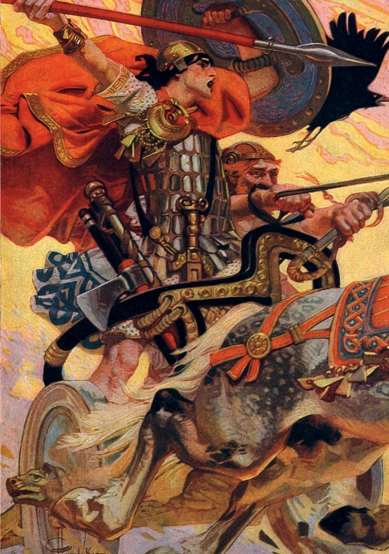 The great hero and warrior Cúchulainn is a central figure of ancient Irish mythology, and is particularly connected with the northern province of Ulster. In one of many versions of the story, he was conceived at Newgrange as the son and incarnation of the powerful god Lug and of Deichtine, daughter of the king of Ulster. Stories of Cúchulainn’s talents in love and war are legion: one such tale, that of the Cattle Raid of Cooley, sees the hero pitted against Medb (Maeve), the strong-willed and ambitious Queen of the western province of Connacht, whose armies invade Ulster to seize its prize stud bull. Cúchulainn wins the day by defeating one enemy warrior after another in single combat, in a display of might that lasts for many months. By turns capable of ferocious anger and of great gentleness and sensitivity, Cúchulainn has been invoked in support of a range of groups over the years. To Irish nationalists, for example, he stands for heroic independence, power, stamina, and ferocity in the face of adversity; equally, he has been claimed by unionists as a symbolic bulwark against invasion from the south.