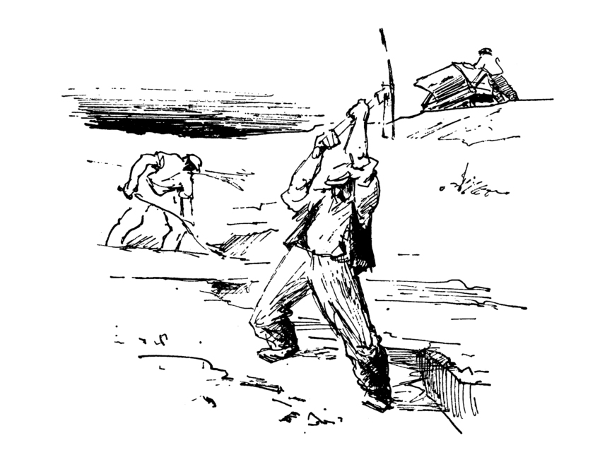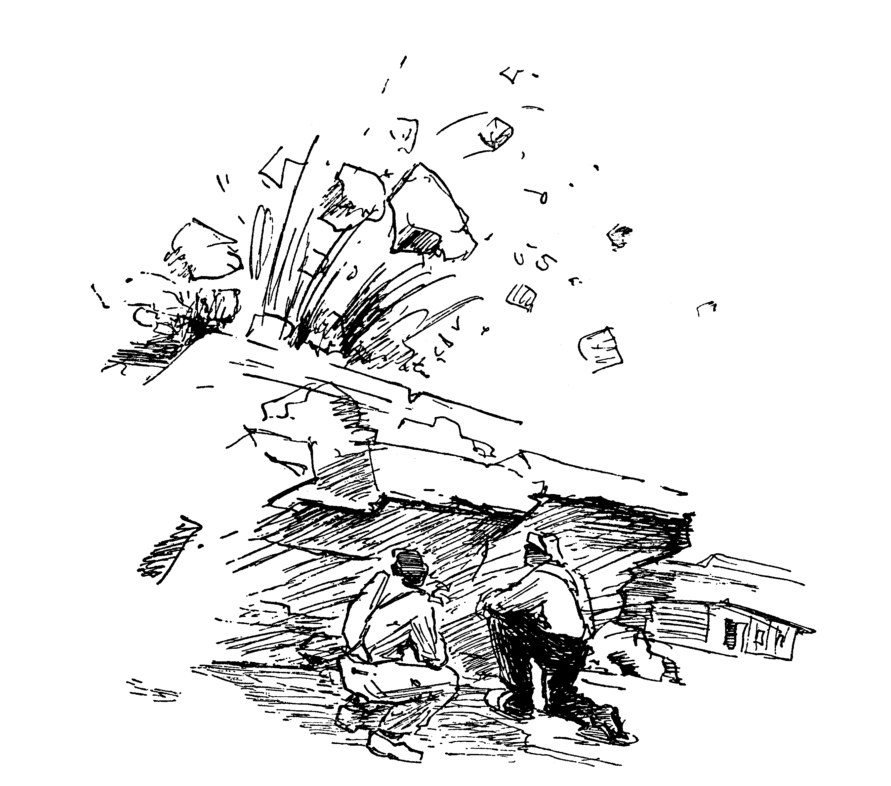 Ich will euch von den Sprengungen noch etwas mehr erzählen, denn es passieren dabei allerlei teils heitere, teils auch recht ernste Dinge. Eines Tages hatten wir wieder eine Sprengung vorbereitet. Das Bohrloch war fertig angelegt, mit Pulver gefüllt und mit Reisig abgedeckt. Der Mann mit der Glocke gab sein Warnungssignal, die Zündschnur glimmte schon, und jedermann brachte sich in Deckung. Auf einmal knallte die Explosion wie der Abschuss eines schweren Geschützes. Reisig und Steinbrocken flogen zischend, schwirrend und pfeifend durch die pulverqualmerfüllte Luft. Mehrere Felsstücke durchschlugen das Dach des Unterkunftsraumes der Arbeiter, von denen glücklicherweise niemand verletzt wurde. Trotz des Unheil verkündenden Getöses war die Sache glimpflicher abgelaufen, als wir schon befürchtet hatten.