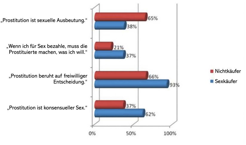 Sexkauf ist nicht nur in vielen Fällen selbst bereits die Ausnutzung einer Zwangslage, es verändert auch die Ansichten der Männer. In einer Studie von 2011 hat die US-Amerikanerin Melissa Farley nachgewiesen, dass sich die Ansichten von Sexkäufern und Nicht-Sexkäufern deutlich unterscheiden („Comparing Sex Buyers with Men Who Don’t Buy Sex”). Signifikante Unterschiede zeigen sich etwa bei der Aussage: „Wenn ich bezahle, muss die Prostituierte machen, was ich will“. Mit diesem wachsenden Dominanzanspruch steigt auch das Gewaltpotenzial gegenüber den Prostituierten.