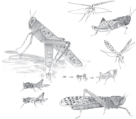 Grasshoppers. One of the best-known insect dispersers, the “migratory locust” (the grasshopper, Schistocerca gregaria), engages in some of the most spectacular mass movements in the animal kingdom. On the African continent, this species has been famous since biblical times. Swarms of the “locust” have blackened the skies, and as those in the vanguard settle onto the earth and consume every green thing where they land, the rest fly over them until they reach more green, while those behind then take flight and do the same, and so a horde of hundreds of millions moves along, stripping all vegetation in its path. Predators cannot put a dent in those hordes. Additionally, the migratory locust is distasteful to potential predators because when it migrates, it is not choosy about what it ingests and takes up toxins from poisonous plants, which it incorporates into its tissues. The grasshoppers’ bright red-orange and yellow coloration, like that of many insects including the monarch butterfly, reminds potential predators of its distastefulness.