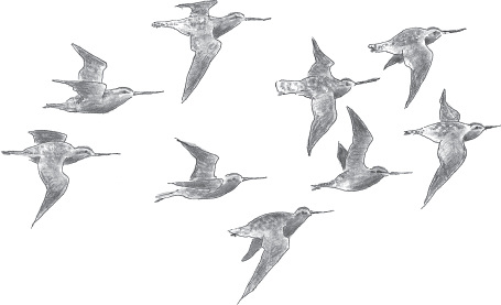 I may be anthropomorphizing to suggest the godwits have a “love” of home, but although we can never know what they feel, it is hard to deny that they do feel. We can say that, along with the aforementioned cranes Millie and Roy, it is highly unlikely that conscious logic could drive them from one continent to the next. Animal behavior is first of all driven by emotion, although in us the emotion can be secondarily buttressed and/or amplified by logic. That said, we admire emotions that help us accomplish great things. We admire the drive and commitment that the birds show because our individual extraordinary feats pale in comparison to those of a godwit. The first lizards that sprouted feathers on their forelimbs could shield themselves from the rain and cold and may have been able to glide several meters, but for that they probably did not need drive related to homing. To fly nonstop for eleven thousand kilometers over open ocean, though, without taking a bite of food, a swallow of water, or a minute of sleep, is a mind-boggling demonstration of the epic importance of home, and of the ability and drive to return to it of even tiny birds.