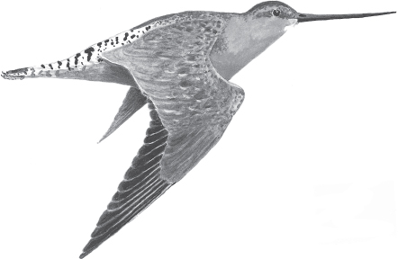 The bar-tailed godwit is not a particularly unique shorebird, as such. (The Hudsonian godwit, Limosa haemastica, performs similar flights from Manitoba to Tierra del Fuego and back.) But in the past ten years, possible extremes of homing ability and some astounding physical capacities that back up this behavior have been revealed by Robert Gill Jr., a biologist with the U.S. Geological Survey, who deployed twenty-three godwits with either solar-powered backpack transmitters or battery-powered surgically implanted ones in the abdominal cavity. The transmitters trailed thin antennas behind the birds, and the radio signals from them indicated their location and were received by polar-orbiting satellites. The data of the godwits’ locations throughout their flights was then calculated on the ground. Nine of the transmitters functioned for two years, yielding data on both the southern fall migration to Australia as well as the spring migration back home to the breeding grounds in Alaska.