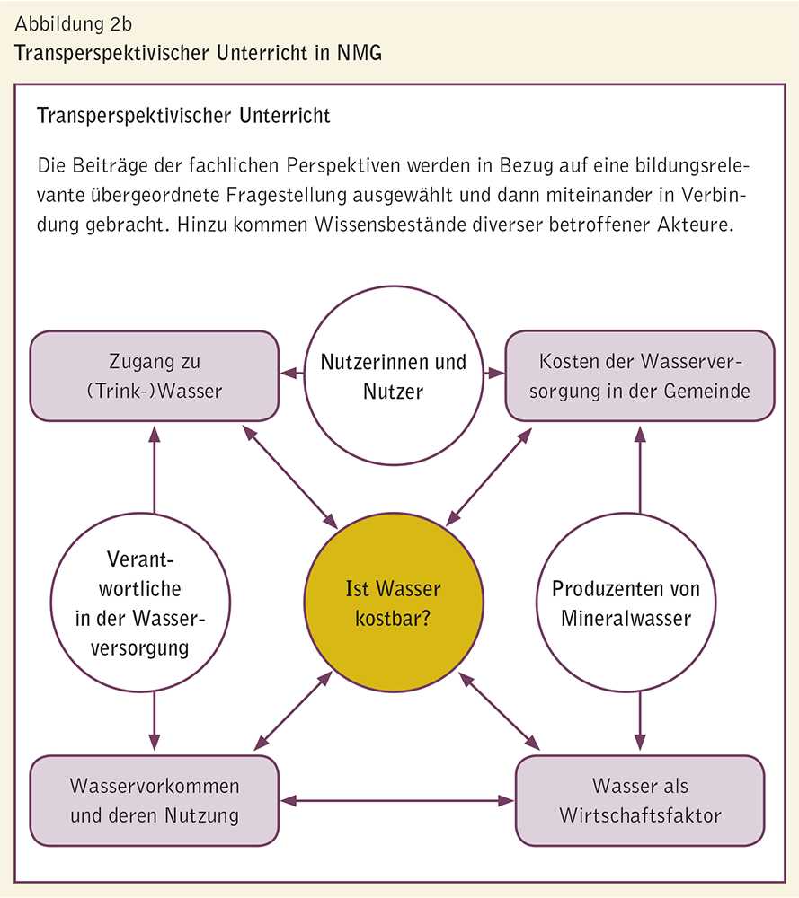 Komplexe gesellschaftliche Fragen, wie sie zum Beispiel von einer «Bildung für eine nachhaltige Entwicklung» (BNE) aufgeworfen werden, lassen sich selten allein durch die inhaltlichen und methodischen Angebote der fachlichen Perspektiven von NMG beantworten. Werden durch perspektivenübergreifendes Arbeiten Wissen sowie Denk- und Arbeitsweisen verschiedener fachlicher Perspektiven miteinander verbunden, so geht transperspektivisches Arbeiten darüber hinaus, indem ausserwissenschaftliches Akteurswissen zur Bearbeitung komplexer gesellschaftlicher Fragestellungen miteinbezogen wird.[27] Gemeindemitarbeitende und Angestellte von Wasserwerken könnten durchaus wertvolle Erkenntnisse beitragen, zum Beispiel zu unserem Unterrichtsthema «Ist Wasser kostbar?».