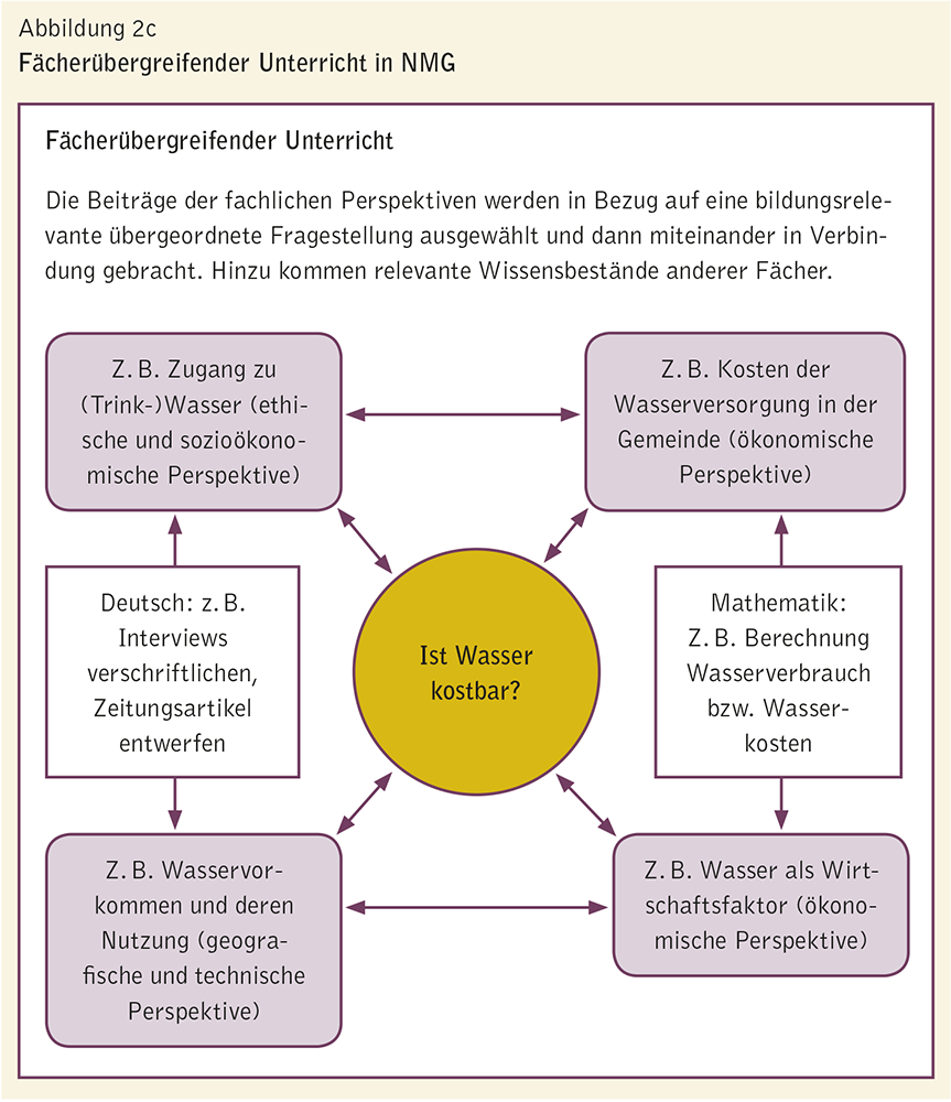 Eine fünfte Variante betrifft schliesslich das fächerübergreifende Arbeiten (siehe Abb. 2c). Während die perspektivenübergreifende Variante in Bezug auf eine übergeordnete Fragestellung Wissensbestände und Handlungsaspekte aus fachlichen Perspektiven von NMG ins Auge fasst, werden im fächerübergreifenden Unterricht neben Wissensbeständen verschiedener fachlicher Perspektiven von NMG auch Wissensbestände anderer Schulfächer zur Beantwortung einer übergeordneten Fragestellung hinzugezogen. Wenn wir wieder von der Fragestellung «Ist Wasser kostbar?» ausgehen, könnten dies die Fächer Mathematik (Wasserkosten oder Wasserverbrauch berechnen) oder Deutsch (Texte aufgrund von Interviews mit Gemeindevertretern entwerfen) sein. Der fächerübergreifende Unterricht in NMG bietet, wie der Lehrplan betont, «die Möglichkeit, die Grenzen der einzelnen Fachbereiche aufzulösen und Themen aus verschiedenen Perspektiven zu betrachten. Erst damit werden Komplexität und Zusammenhänge von Phänomenen und Situationen deutlich.»[28] Das, so heisst es weiter, trägt «zu einem bereichernden und vertiefenden Unterricht» bei.[29] Konkret kann fächerübergreifender Unterricht für NMG dann angebracht und sinnvoll sein, wenn die übergeordnete Fragestellung durch das Hinzuziehen von Wissensbeständen anderer Fachbereiche vertiefter und breiter beantwortet werden kann. Entscheidend ist dabei, dass es auch aus der Sicht der hinzugezogenen Fächer sinnvoll ist, sich auf diese Frage einzulassen. Blosse Alibibeiträge, Lückenfüller oder reine Unterhaltungsaktivitäten wären damit ausgeschlossen.