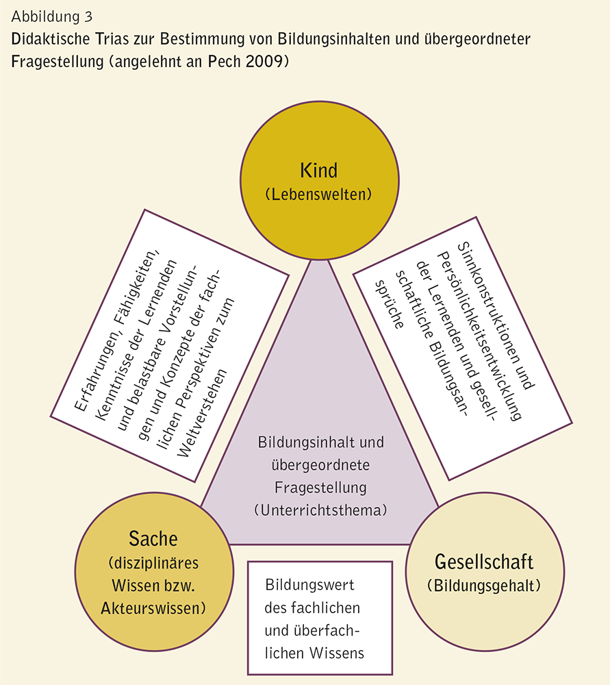 Wie oben beschrieben, besteht bei der Unterrichtsplanung ein erster Schritt in Richtung übergeordneter Fragestellung zunächst darin, mögliche Bildungsinhalte anhand der didaktischen Trias zu bestimmen. Der Aspekt «Kind» bezieht sich auf Begründungen zum Begriff der Lebenswelt, der Aspekt «Sache» geht von den inhaltlichen und methodischen Angeboten der fachlichen Perspektiven von NMG bzw. vom Akteurswissen beteiligter Akteure aus, der Aspekt «Gesellschaft» hat den Bildungsbegriff als Grundlage (siehe Abb. 3). Zwischen den drei Eckpunkten des Dreiecks bestehen jeweils Spannungsverhältnisse, so zum Beispiel zwischen «Kind» und «Sache». Auf der einen Seite stehen Fragen, Bedürfnisse, Vorwissen, kurz die Sichtweise der Kinder von der Welt, die für sich allein genommen zur Begründung von Bildungsinhalten nicht genügen. Auf der anderen Seite steht das inhaltliche und methodische Wissen der wissenschaftlichen Disziplinen von NMG (die «Sache»). Für Kahlert besteht die Aufgabe von NMG gerade darin, Kindern fachlich belastbares Wissen und Können zugänglich zu machen. Aber ohne Bezug zur kindlichen Lebenswelt wäre dieses Wissen steril.[52] Hinzu kommt – als zweites Spannungsverhältnis –, dass dieses Wissen und Können auch relevant sein sollte, um einen Beitrag zum Weltverstehen der Kinder zu leisten, zum Beispiel im Sinne von Heymanns Teilaufgaben von Bildung (siehe Tab. 3). Die Überlegungen zur Bildungsrelevanz stehen ihrerseits in einem dritten Spannungsverhältnis zu den individuellen und persönlichen Lebensentwürfen der Kinder. Aus dem Zusammenwirken dieser drei Bereiche des Dreiecks und unter Berücksichtigung der bestehenden Spannungsverhältnisse lassen sich mögliche Bildungsinhalte bzw. darauf aufbauend übergeordnete Fragestellungen (Unterrichtsthemen) von NMG bestimmen.