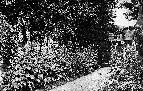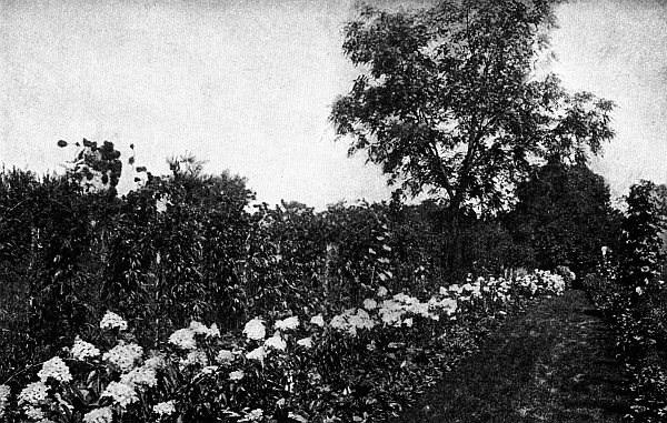 When Narcissus Poeticus has finished blooming, the Peonies come on. Before the last Peony has lost its petals, the Sweet Williams (quite two feet high) are in blossom, and the Foxgloves (from three to four feet high) begin to bloom, and last for a month. While these flowers are still lovely, the tall Hollyhocks begin to flower, each plant sending up from three to five stalks. Then, by the time the Hollyhock stalks are cut down, the Hydrangeas, which are trimmed back very severely every autumn, are a mass of white. Meanwhile the Rudbeckias, for quite six weeks, form a yellow background. The illustrations show this row of flowers while the Narcissi, Peonies, Foxgloves, and Hydrangeas are successively in blossom.