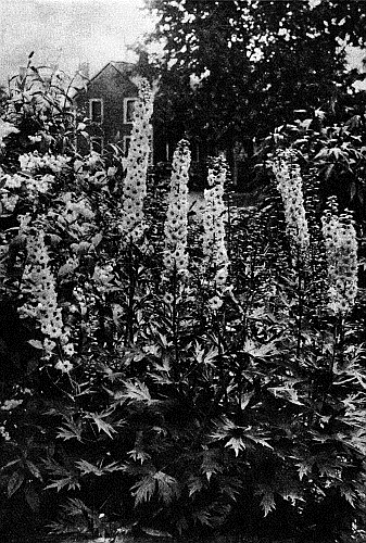 One can never say enough in praise of Delphiniums. Three-year-old plants will send up eight to ten beautiful great spikes of the richest blue, four feet high. The moment a blossom withers, cut the stalk down to the ground; another will immediately spring up. I had four crops of blossoms from some of my Delphiniums last summer, so that, from the end of June until the middle of October, there were always some of them in blossom. Some varieties of tall English Delphiniums are very beautiful. Among them is one, Cœlestinum, of the loveliest shade of light blue, with very large, double individual flowers. As I have said before, the Delphinium blossoms at the same time as Lilium candidum, and should be planted near by. Great bunches of these two flowers, in tall vases, are lovely as well as unusual.