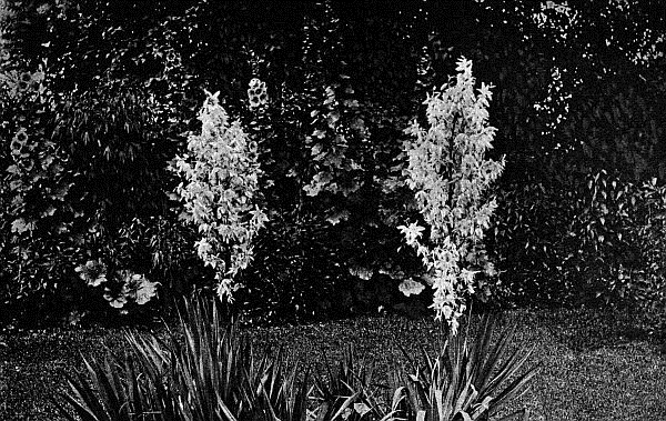 Yucca filamentosa, the hardy native of Mexico, sends up, about the tenth of July, great stalks six to eight feet high, bearing masses of white flowers. The individual blossoms are of creamy waxy texture and as beautiful as an orchid. A single stalk of Yucca, in a tall vase, will last nearly a week, and is as unusual as it is beautiful for house decoration. Yuccas are perfectly hardy, need no protection in winter, no fertilizer, no water in dry weather. In my garden, at least, they have not been attacked by insects and have grown placidly on, needing absolutely no care but to have the stalks cut down when they have finished blossoming. They are most effective when grown in clumps, but look very well along a fence with Hollyhocks at the back. The plants are so inexpensive that I have bought mine, but see no reason why they cannot be raised from seed. Small plants form near the parent stem, and these can be separated and transplanted. A late spring frost will sometimes nip the flower stalk that has just started, and there will be no bloom that year. To avoid such a disaster, whenever, in late spring, a frosty night is suspected, cover the plants with a piece of burlap.