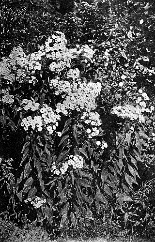 The newer varieties of Phlox come in the most beautiful colours, – dark crimson, fiery scarlet, many shades of pink, pink striped with white, and pink with a white eye; all shades of lilac, lilac with white and purple, the beautiful pure white, and the white with the scarlet eye. Of all the varieties, my favorites are the snowy white, and the salmon-pink with the dark red eye. Buy fifty large field-grown plants; at the end of three years separate them, and you have a hundred and fifty. They present a picture of progression much surer than the tale of the eggs that were to do so much.