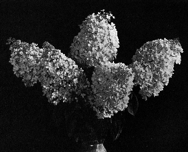 Hydrangea paniculata grandiflora, the finest of all hardy shrubs. The flowers are great panicles of white. They bloom about the first of August and remain beautiful for six weeks, slowly changing to a soft, dull pink. This shrub is most effective when grown in masses of a dozen or more, although single specimens are very fine. They must be vigorously cut back late every fall, leaving only about six inches of new growth.