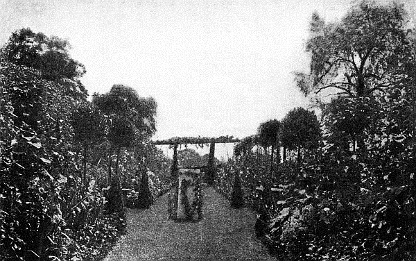 Crimson Rambler Roses twine about the pedestal. At the corners of the four paths are standard Box trees, which stand like sentinels, and between them there are Bay trees in terra-cotta vases of simple shape – copies of antique ones.