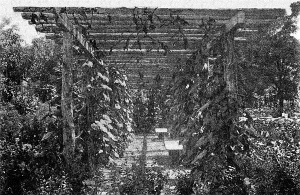 PERGOLAAcross the end of this garden is a rustic pergola seventy feet long, made of cedar posts cut from the woods on the farm, ten posts on a side, each post being set four feet deep. A string-piece of heavy chestnut rests on the tops of each row of posts. Cedar poles ten inches apart extend across the top and project two feet over each side. The pergola is eight feet wide and ten feet high, is easy to build and very effective. Care must be taken to set the posts at least four feet. At each post are planted a two-year-old root of Wistaria and one of Virginia Creeper, and I live in the hope of some day seeing the vines cover the pergola. The ground slopes gently where this is built, and the first autumn after it was made, it looked, from a little distance, so much like a section of an elevated railroad as to be very depressing. But one must possess imagination to be a gardener, and have the ability to see the garden as it will look “next year.” So I refused to see the pergola except as clothed with vines, and in May, with the beautiful racemes of Purple Wistaria hanging from every rafter.